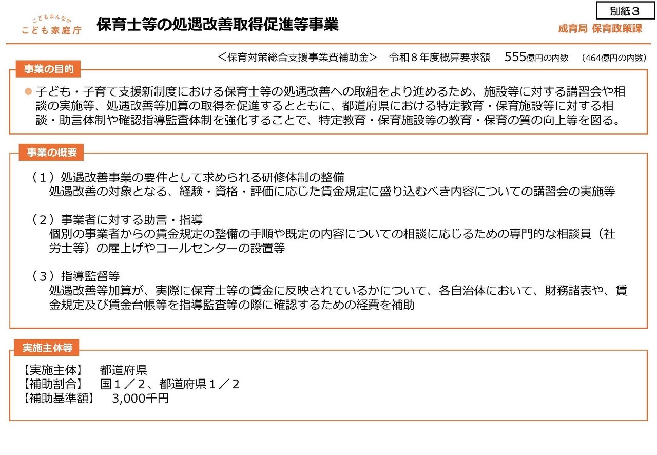 保育対策総合支援事業費補助金の「保育士等の処遇改善取得促進等事業」(別紙3を参照。)により、保育士等の処遇改善への取組をより進めるため、施設等に対する講習会や相談の実施等を行う場合の補助を行っている。と記載あります。